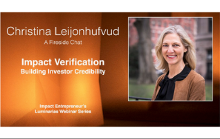 In this live webinar and audience Q&A, Impact Entrepreneur’ Laurie Lane-Zucker welcomes BlueMark CEO Christina Leijonhufvud to discuss recent efforts to standardize impact management and measurement and the power of impact verification to bring accountability, discipline and comparability to the impact investing market.
