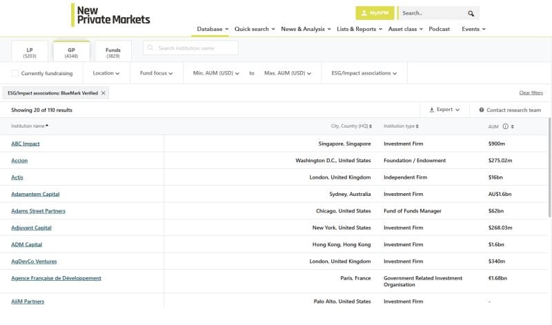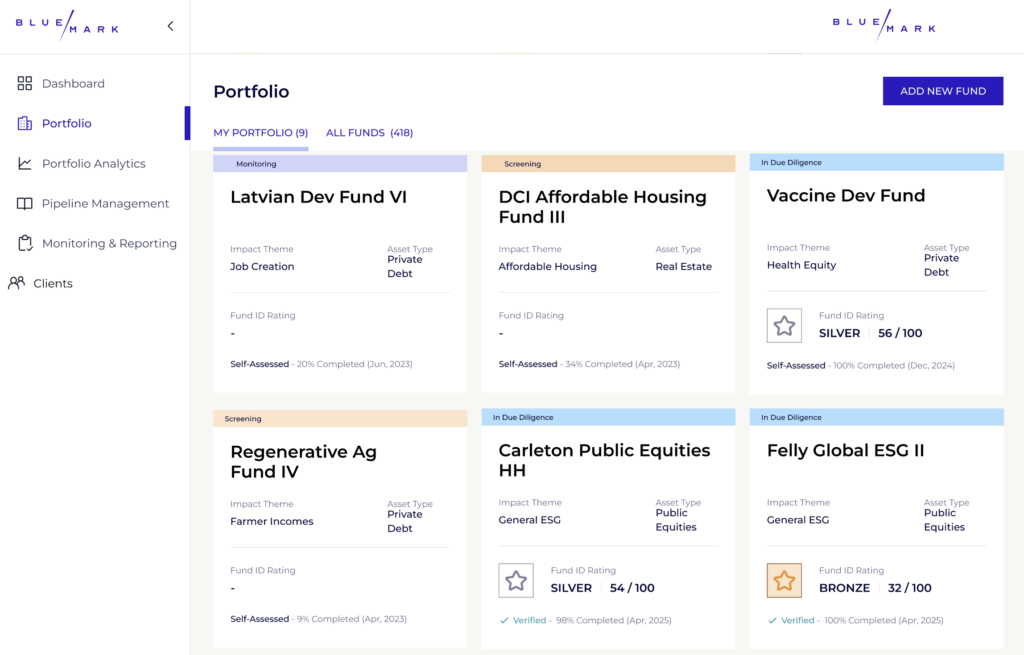 Additionally, BlueMark IQ, our new market intelligence platform designed for asset allocators, features a directory of verified funds with explicit impact and sustainability objectives. Allocators using the platform will be able to search the directory to identify, learn more about, and connect with funds of interest.