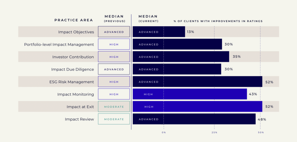 BlueMark’s data also indicates that ‘best practice’ in impact performance is a moving target, as demonstrated by the four clients who saw their ratings decrease in one practice area upon re-verification. This signals that the industry continues to mature and that what was once considered best practice is now table stakes for sustainable and impact investing. The rapid pace of this maturation provides further evidence on the need for investors to regularly assess how they compare to the current state of the market.